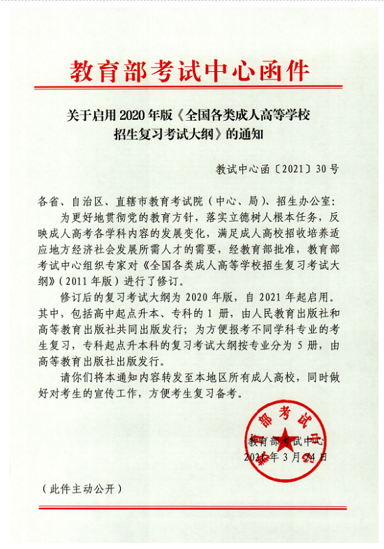 2021年3月9日,教育部考试中心下发了一则《关于启用2020年版<全国各类成人高等学校招生复习考试大纲>的通知》(教试中心函〔2021〕 30号),自2021年起,全国成人高等学校招生入学考试(成人高考)命题将按新大纲(2020年版)进行。