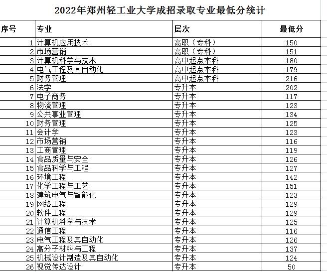 下面是郑州轻工业大学成人高考录取分数线,老师在下面列出来供各位考生参考。以下内容不代表官方,具体每位考生的录取情况,请以考生的最终录取结果为准。郑州轻工业大学有三个层次的专业:高起专、高起本和专升本,大概有如下这些,下面是具体的分数线情况: