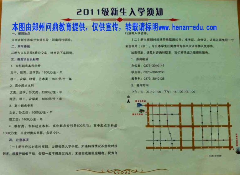 如下图所示,以河南科技学院成人教育学院为例,在成人高考录取通知书的背面有新生入学须知。