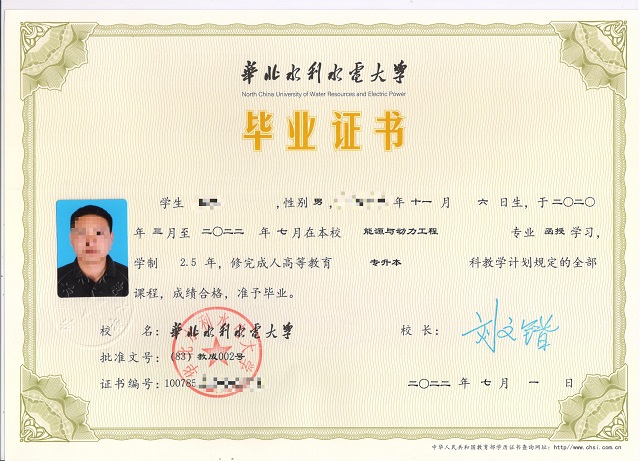 华北水利水电大学成人高考毕业证样本