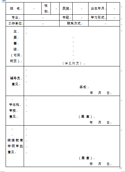 河南科技大学成人高考优秀毕业生推荐表及样本