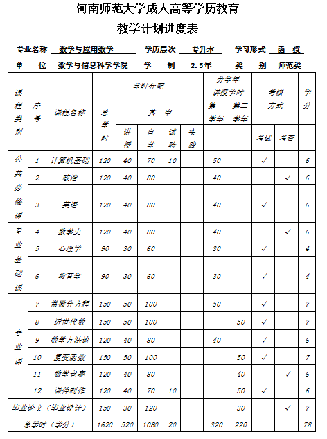 六、河南师范大学成教专升本(函授)数学与应用数学专业教学计划进度表
