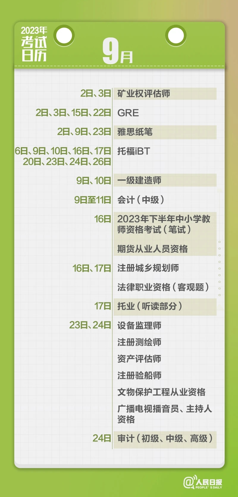 2日、3日考矿业权评估师;2日、3日、15日、22日考GRE;2日、9日、23日考雅思纸笔;6日、9日、10日、16日、17日、20日、23日、24日、26日考托福iBT;9日、10日考一级建造师;9日至11日考会计(中级);16日考2023年下半年中小学教师资格考试(笔试)、期货从业人员资格;16日、17日考注册城乡规划师、法律职业资格(客观题);17日考托业(听读部分);23日、24日考设备监理师、注册测绘师、资产评估师、注册验船师、文物保护工程从业资格、广播电视播音员、主持人资格;24日考审计(初级、中级、高级)。