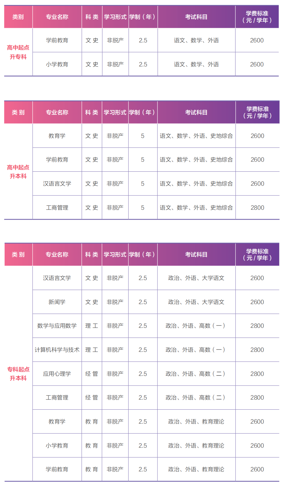 学校招生专业多,招生层次共分为三个层次,具体招生专业如下图,图中包含各专业的考试科目!
