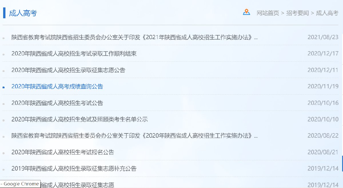 点击进入》》》陕西招生考试信息网,首页点击【招考要闻】下拉至【成人高考】点击进入即可。
