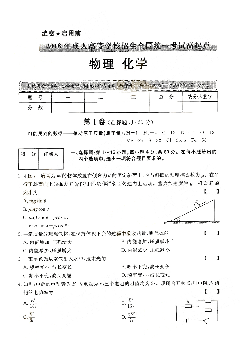 2018年全国(河南)成人高考高起点理科综合《物理化学》真题及答案(1)