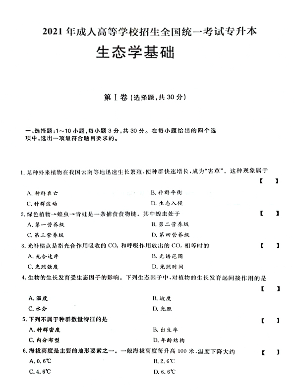 成人高考又叫函授教育,考生通过考试入学以后,主要采用函授的方式上课学习,深受考生欢迎。关于2021年全国(河南)成人高考专升本《生态学基础》真题及答案,参考老师下面的介绍。了解更多河南省成人高考相关内容,请参考:河南省成人高考报考指南。