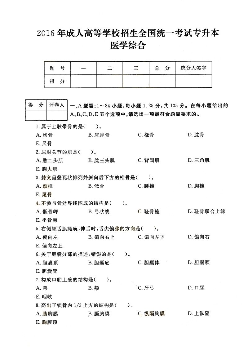 2016年全国(河南)成人高考专升本《医学综合》真题及答案(1)