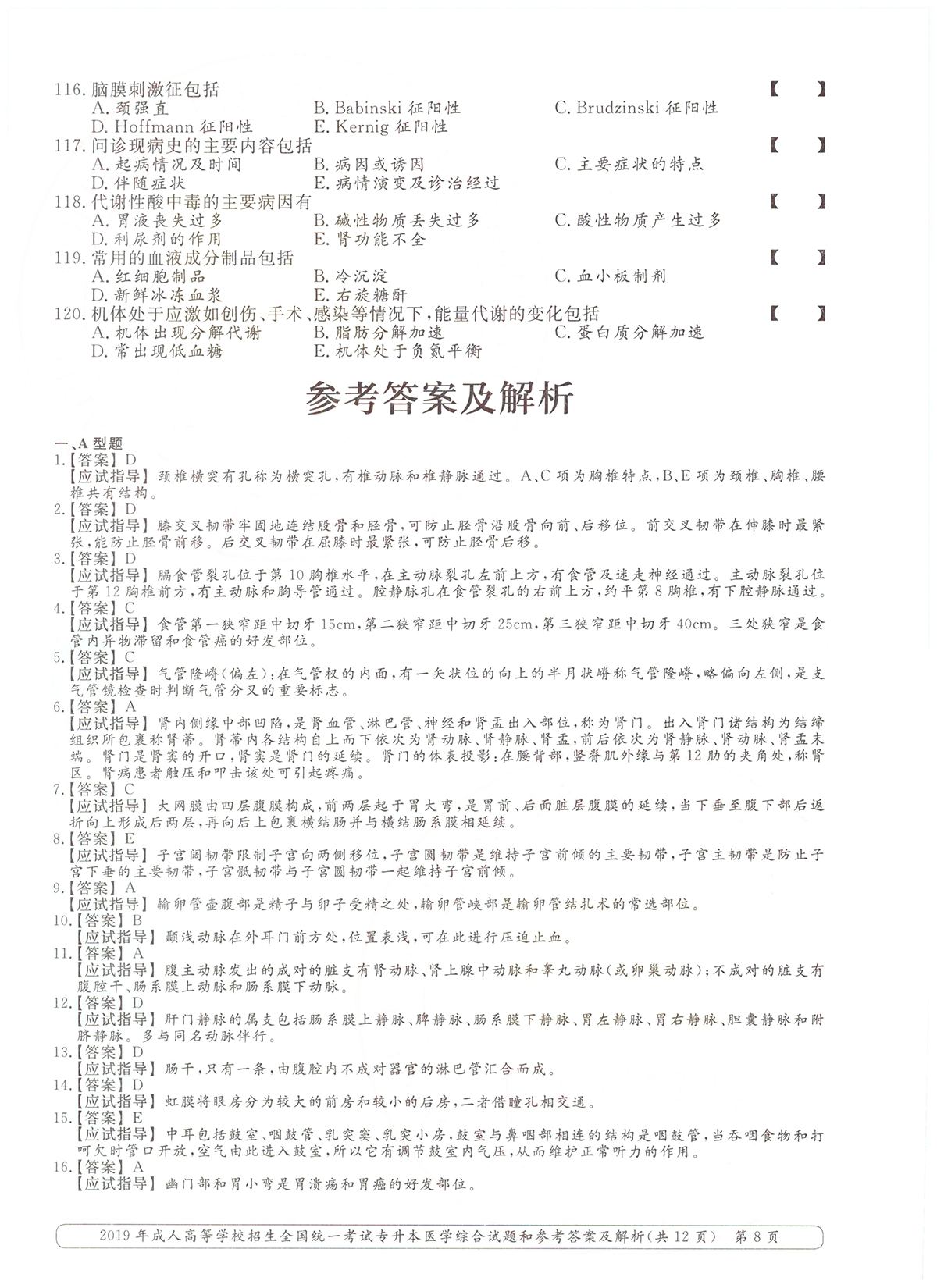 2019年全国(河南)成人高考专升本《医学综合》真题及答案(8)