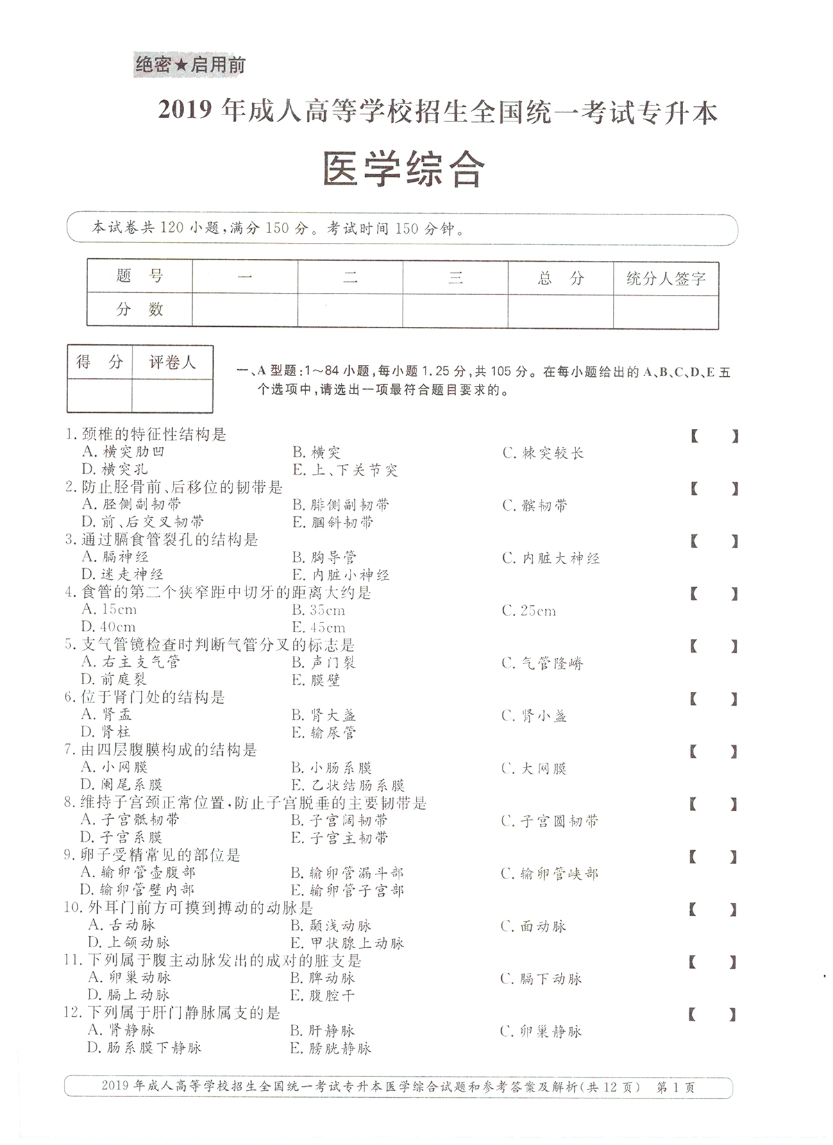 2019年全国(河南)成人高考专升本《医学综合》真题及答案(1)