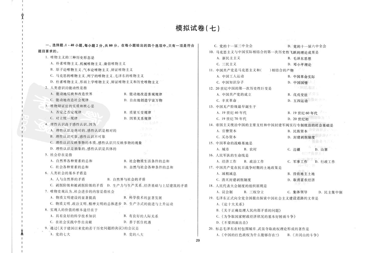 在前些篇文章中,河南成人高考网为大家一共发布了河南成人高考培训政治科目六套独家发行的模拟试卷,希望各位同学能及时学习,认真参加辅导,在十月的成人高考中取得好的成绩,下面为大家发布第七套模拟试卷及答案解析。