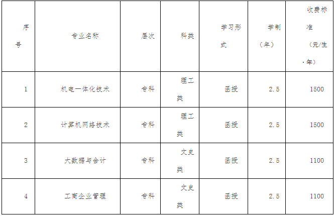 ——在专科层次学历教育方面。我校具备独立举办专科层次成人高等教育的资质。目前开设机电一体化技术、计算机网络技术、大数据与会计、工商企业管理等专业。