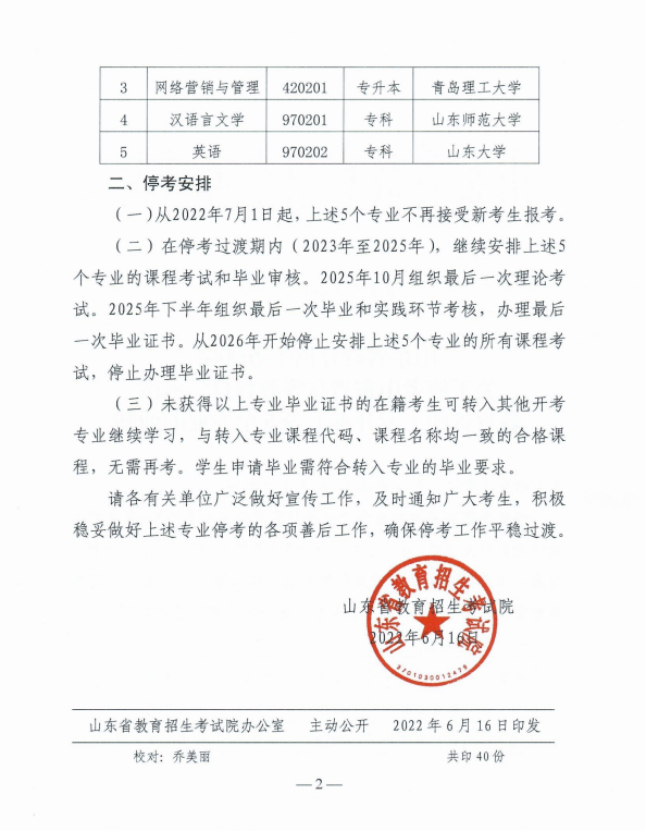 关于停考山东省高等教育自学考试教育管理(专升本)等5个专业的通知