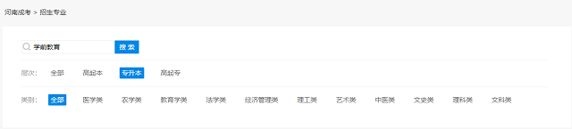 河南成人高考学前教育分三个层次,高起专、高起本、专升本,那么怎么知道开设高起专学前教育的学校有哪些,专升本有哪些,高起本有哪些呢?在河南成人高考网招生专业栏目即可完成自主查询,具体步骤如下: