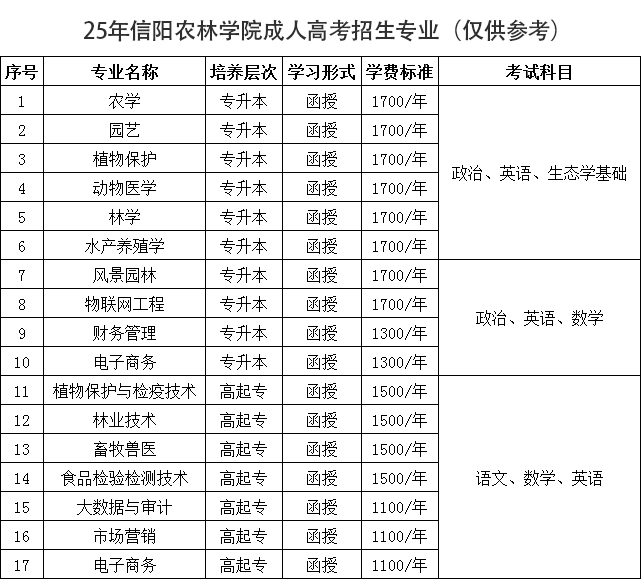 2025年信阳农林学院成人高考的招生专业还没有公布,各位考生可以先将24年的招生专业作为参考!