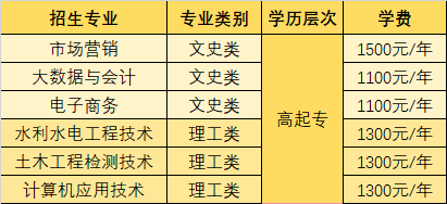 学历函授教育。开设有黄河水院专科层次学历函授教育,与华北水利水电大学、中国矿业大学、河海大学联合开展本科层次学历函授教育,目前学校有成人教育土木工程检测技术、大数据与会计、市场营销和电子商务4个专科层次,土木工程、水利水电工程、测绘工程、水文与水资源工程、环境工程、工程管理、电气工程及其自动化、化学工程、工商管理、电子商务等10个本科层次专业。并可根据社会需求开设相关专业。