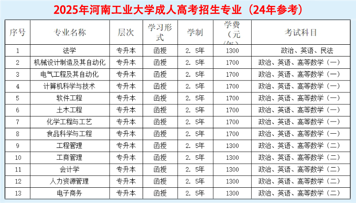 河南工业大学一直都是河南省内非常出名的理工类院校,所以想要报名今年成人高考理工类的同学,都可以考虑报名河南工业大学!河南工业大学成人高考每年招生并不少,所以只要大家好好复习,肯定都能顺利上岸!下面就来给各位考生简单介绍一下2024=5年河南工业大学成人高考招生简章!