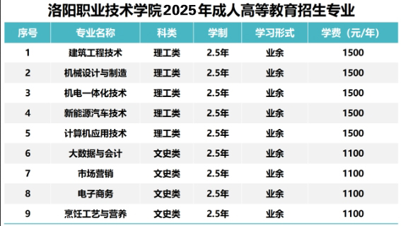 四、2025年洛阳职业技术学院成人高考招生专业
