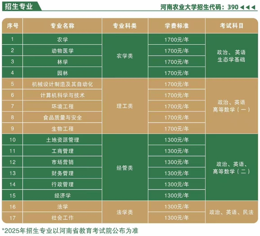 河南农业大学只招生本科专业,共招生4大类专业,具体的专业和学费如下图: