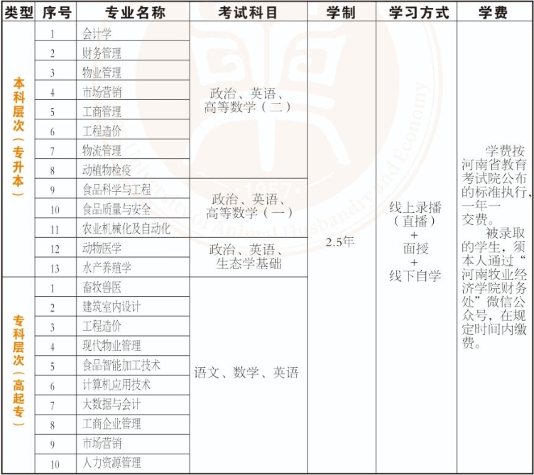 五、2025年河南牧业经济学院成考非脱产招生专业