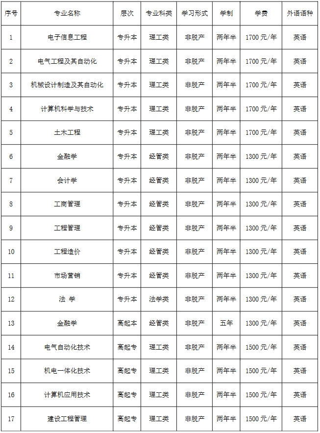 2025年中原工学院成考非脱产招生专业