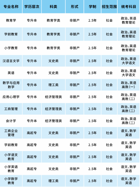 | 专升本 | 文史教育类(含经管) | 非脱产 | 2.5年 | 1300 |