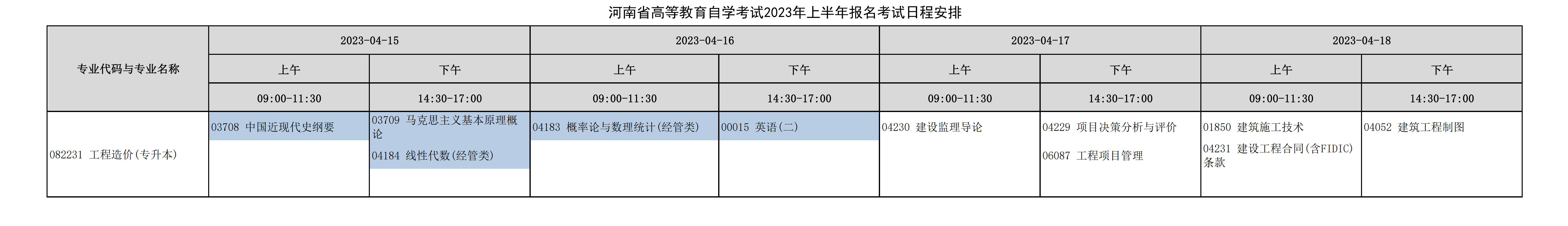 2023年河南省高等教育自学考试上半年考试时间在4月15日-18日举办,因为2022年河南自考没有举行,所以,本次自考考试时间为期4天。下面是本科工程造价专业考试日程安排情况,本文为大家介绍一下。