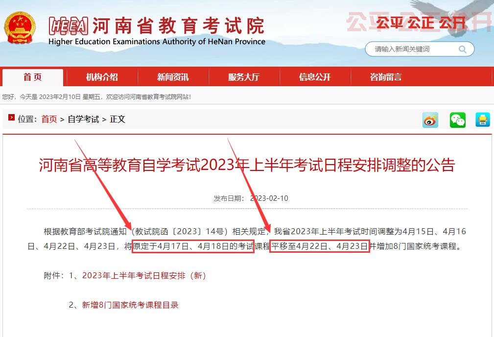 调整公告:“根据教育部考试院通知(教试院函〔2023〕14号)相关规定,我省2023年上半年考试时间调整为4月15日、4月16日、4月22日、4月23日,将原定于4月17日、4月18日的考试课程平移至4月22日、4月23日并增加8门国家统考课程。”