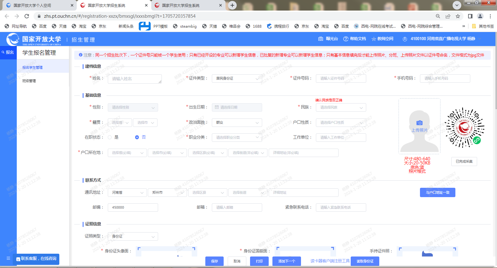 国开有一个专门的招生系统,考生报名必须在学校直属的教学点报名,才可以!只有直属教学点的老师有账号,可以给大家报名注册!(如下图)
